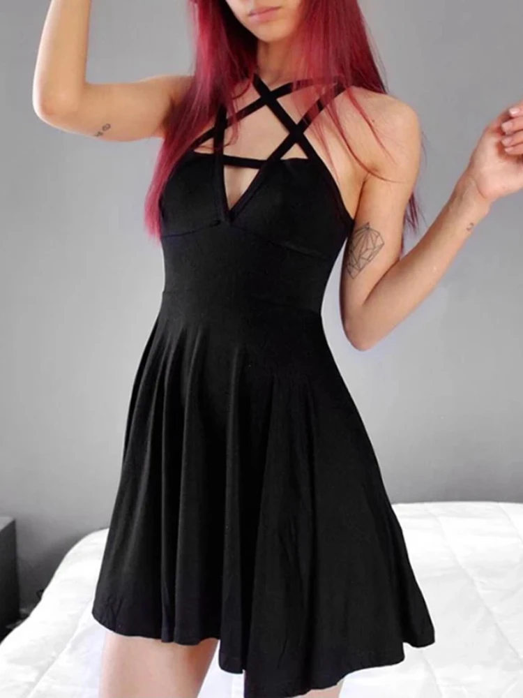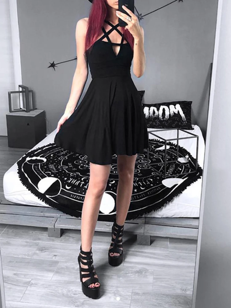 This captivating black dress perfectly embodies gothic and witchcore aesthetics, combining dark elegance with mystical charm. The bodice features a striking crisscross strap design, reminiscent of arcane symbols, that adds an enchanting and mysterious touch. The deep neckline enhances the dress’s allure, while the flared skirt creates a flowing silhouette, ideal for conjuring a dramatic presence. Crafted with a sleeveless cut, this dress is both edgy and graceful, making it an essential piece for those who walk the line between shadow and style. Perfect for rituals, moonlit gatherings, or simply embracing your inner witch.