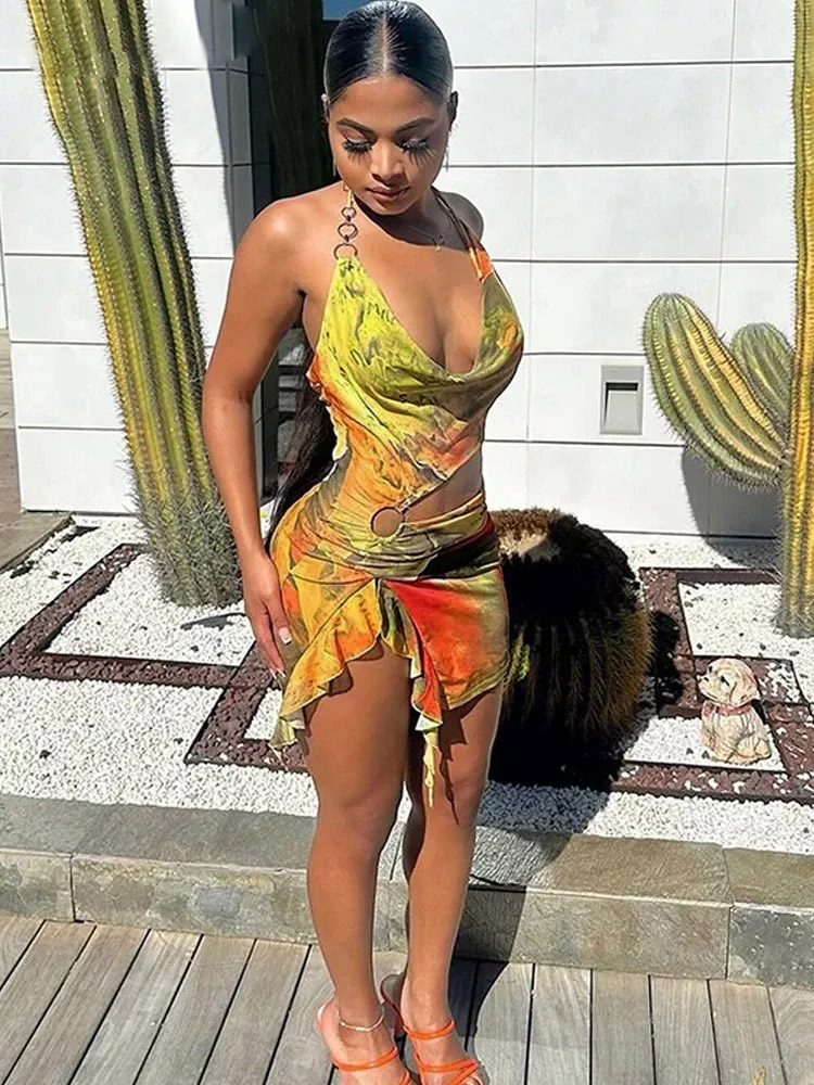 This Tropical Halter Neck Backless Mesh Mini Dress is a vibrant blend of playful and daring elements. The halter neck design elegantly transitions into a backless style, adding a touch of boldness to the look. Delicate ruffles adorn the dress, enhancing its flirty appeal, while the O-ring accents and cut-outs create a chic and contemporary vibe. Perfect for warm weather, this mini dress offers a fresh, tropical flair that’s both stylish and eye-catching.