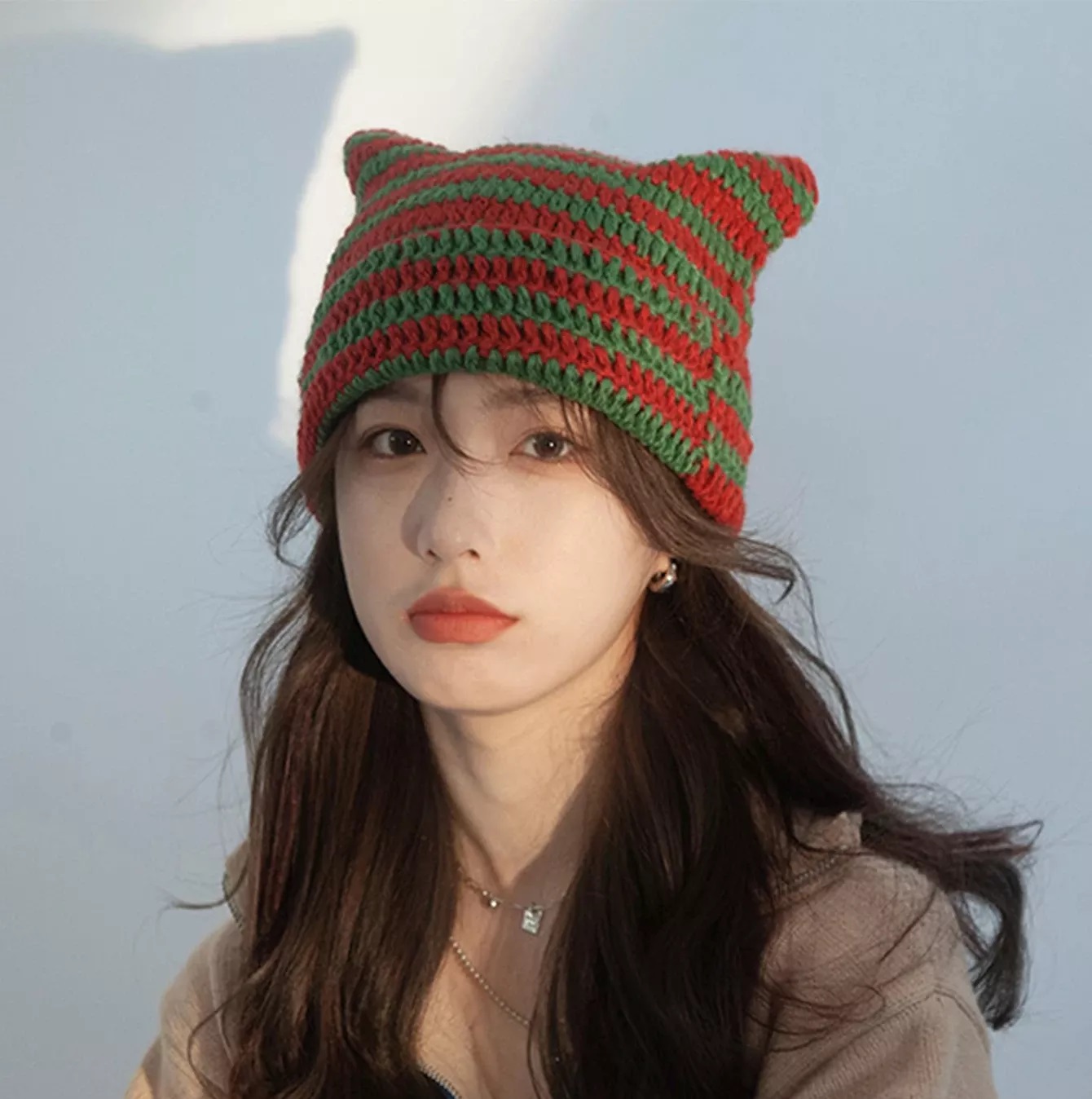 The Cute Cat Ears Beanie Hat is a stylish and playful accessory that seamlessly blends punk and grunge aesthetics with a touch of cuteness. Crafted from warm and cozy knit material, this beanie features adorable cat ears that add a whimsical touch. The striped pattern brings an edgy and rebellious vibe, making it perfect for the colder months. Ideal for creating unique and expressive outfits, this beanie can be paired with a leather jacket and ripped jeans for a full-on punk look, or with a flannel shirt and combat boots for a more grunge-inspired ensemble. This beanie is a must-have for anyone looking to add a playful yet edgy touch to their winter wardrobe.