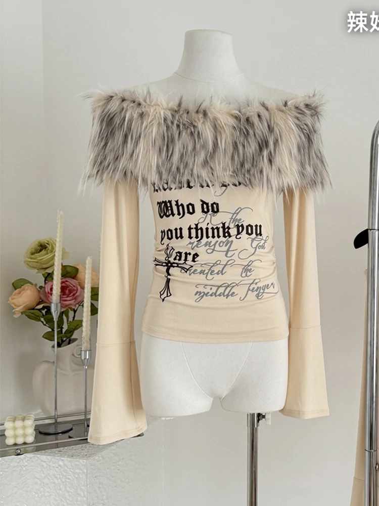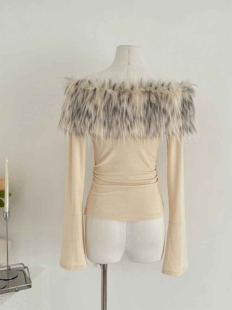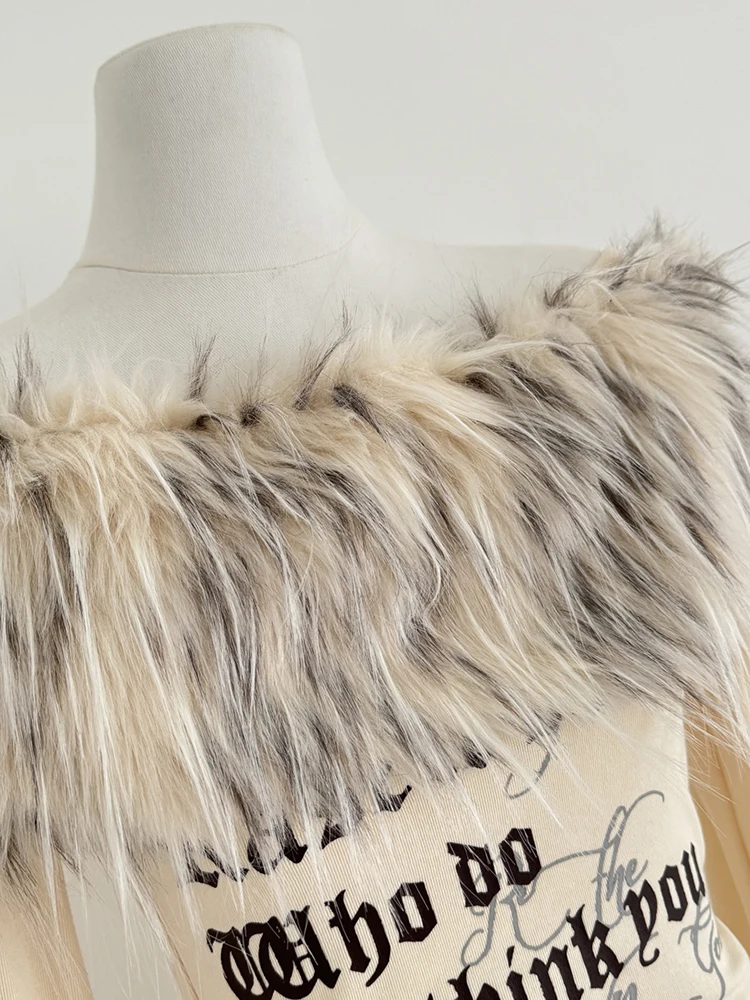 Coquette Slash Neck Off-Shoulder T-Shirt with Fur Collar