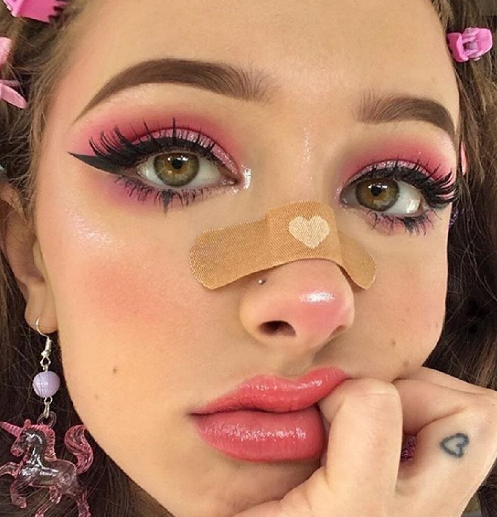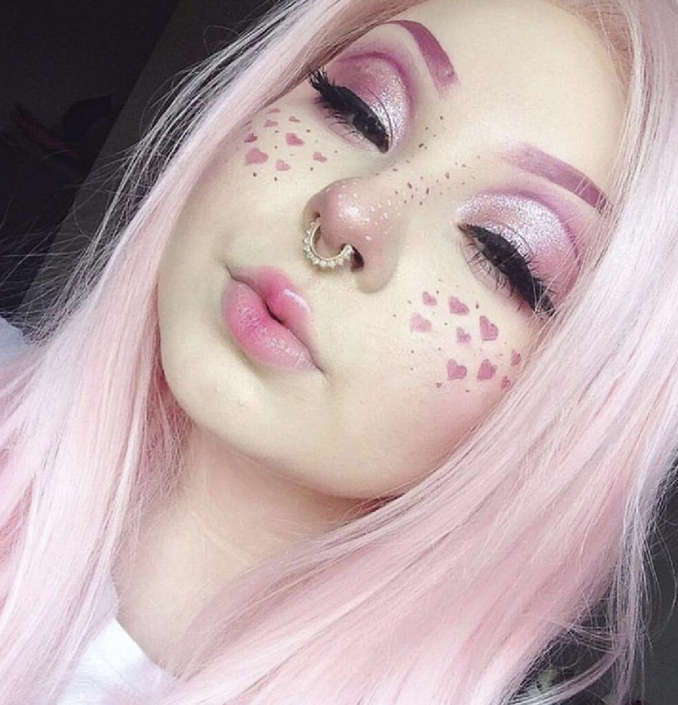 - Bold Makeup: One of the defining features of the E-Girl aesthetic is the bold, expressive makeup. This often includes heavy winged eyeliner, heart or star stamps on the cheeks, and brightly colored eyeshadow. Blush is applied generously across the nose and cheeks to create a youthful, doll-like appearance.