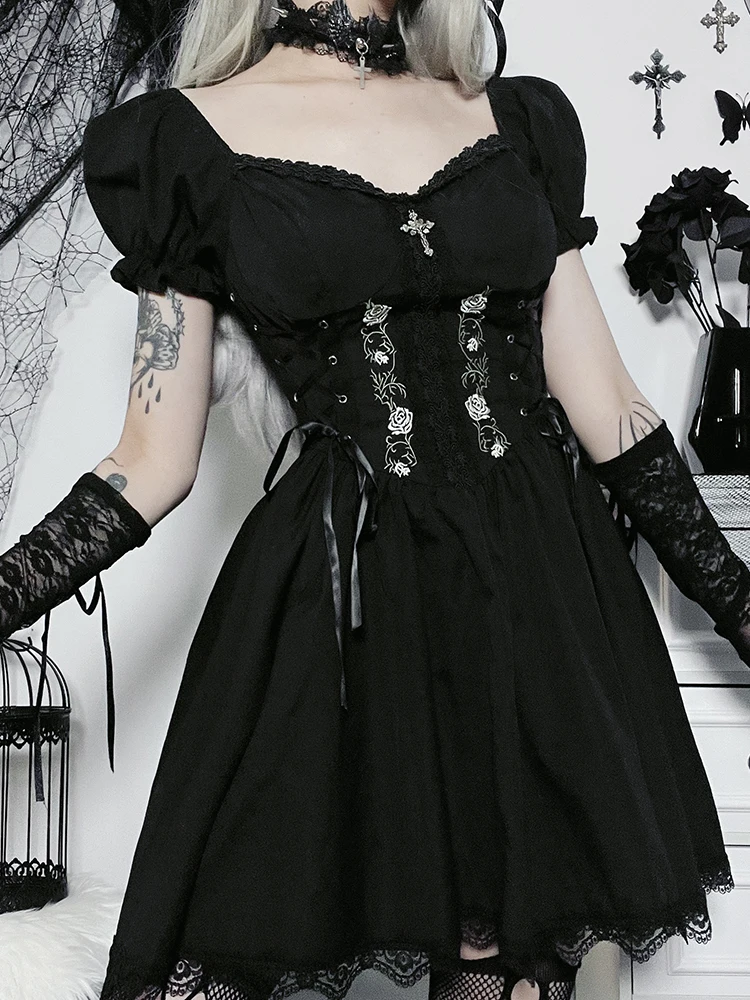 This Vintage Gothic Princess Dress embodies the essence of Dark Harajuku style with its intricate details and dramatic flair. The dress features elegant lacing, a striking cross accent, and a Gothic pattern adorned with roses, exuding a dark romantic charm. The puffy sleeves add a regal touch, while the voluminous skirt, trimmed with delicate lace, enhances its ethereal, princess-like silhouette. Perfect for those who embrace the beauty of Gothic fashion, this dress is a statement piece that merges vintage elegance with modern edge.