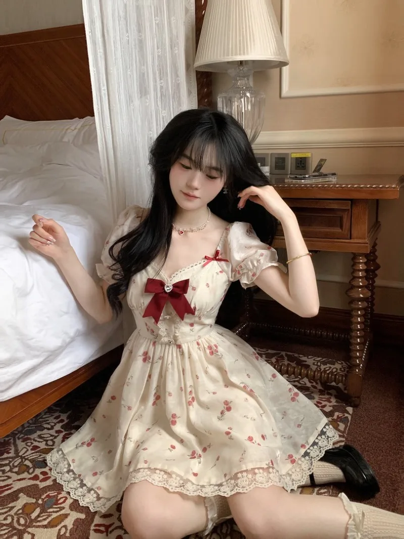 This Elegant Princess A-line Dress captures the essence of Kawaii style with its charming floral pattern and delicate details. The V-neckline adds a touch of sophistication, while the bow accent and lace trim bring a sweet, feminine appeal. Perfect for those who adore the soft girl aesthetic, this dress combines grace and playfulness, creating a look that’s both elegant and endearing. Ideal for any occasion where a touch of whimsy and elegance is desired.