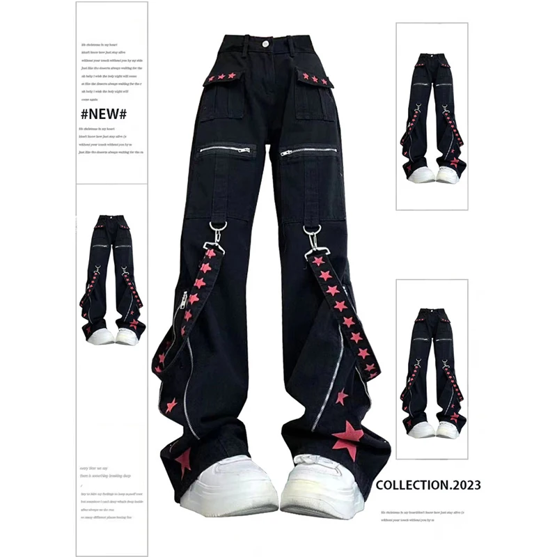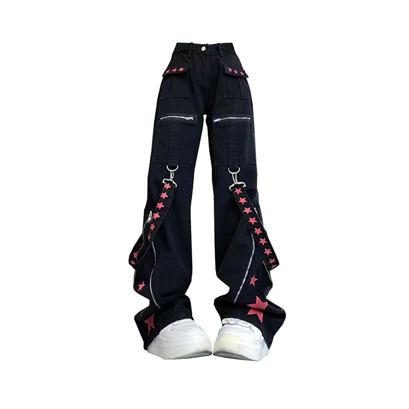 These Black Gothic Baggy Cargo Jeans are the epitome of Harajuku and Acubi aesthetics. Adorned with belts, star prints, and zippers, they offer a striking blend of rebellious style and practicality. The wide-leg design ensures a comfortable fit while the detailed decorations add a bold, alternative flair to your look. Perfect for making a statement, these jeans are a must-have for anyone embracing unique and daring fashion.